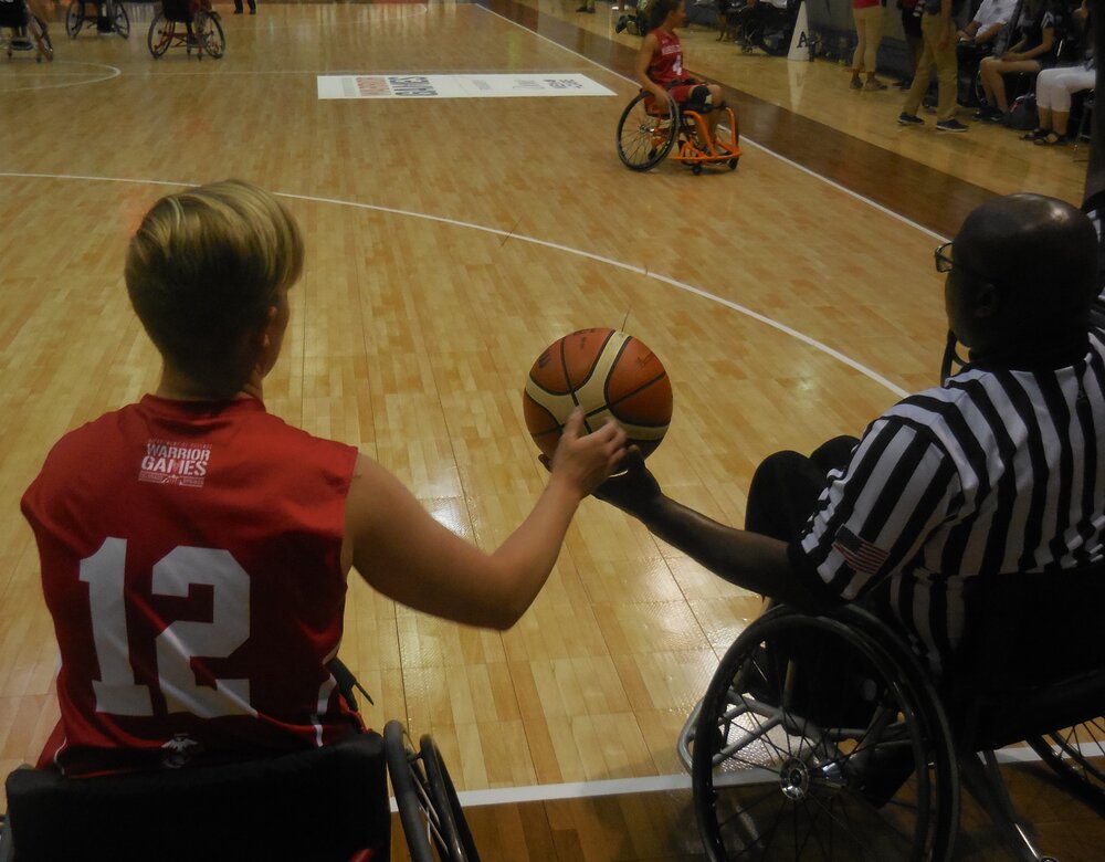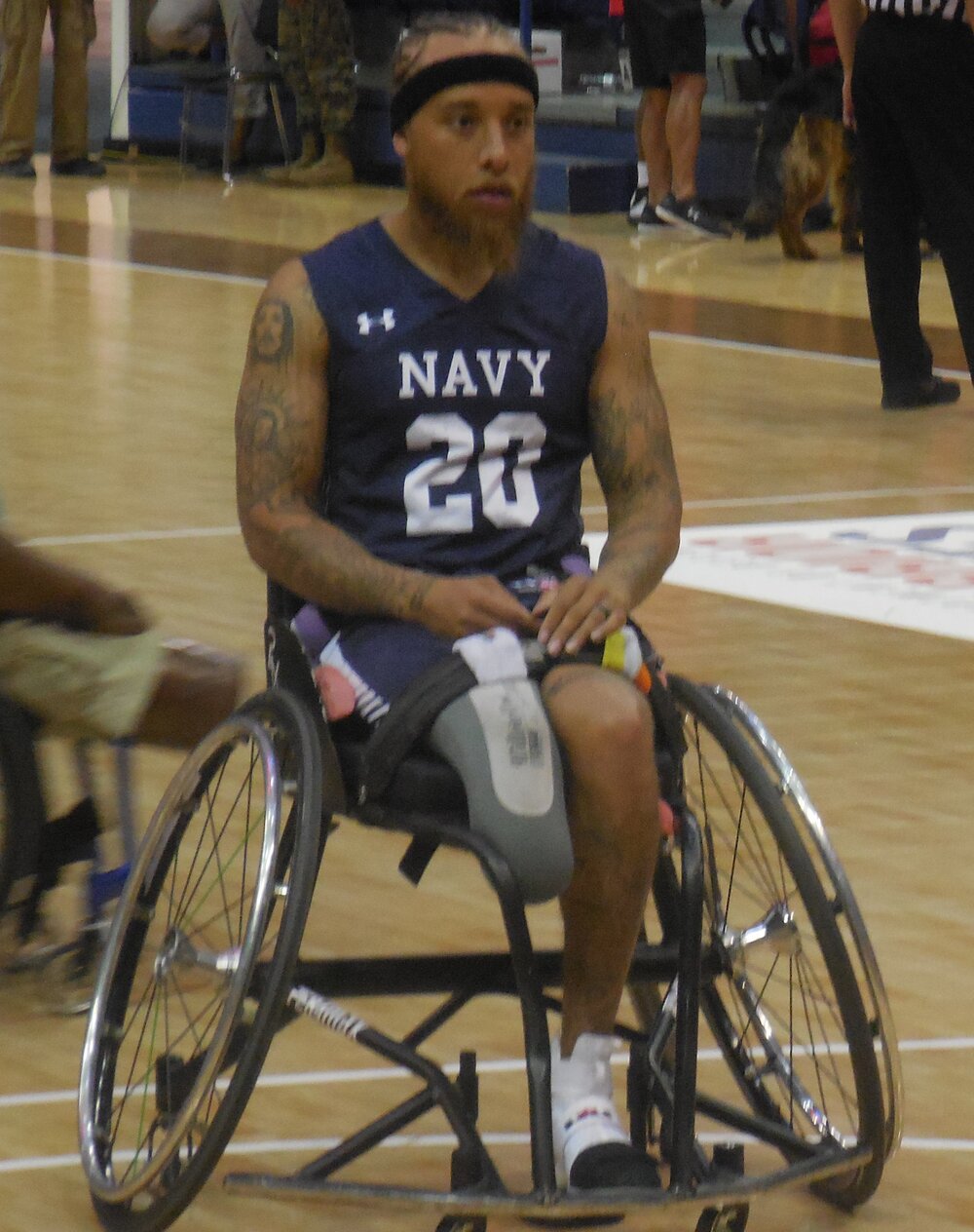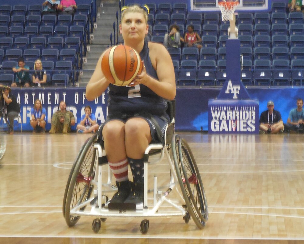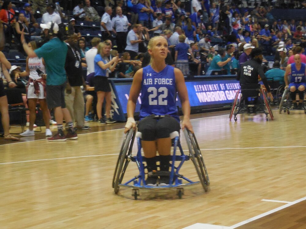 Kristen Morris represented the Air Force in wheelchair basketball on Saturday, but also participated in cycling, field, sitting volleyball, swimming, and track. Her injuries? Left and right hip reconstruction and a total right hip replacement.