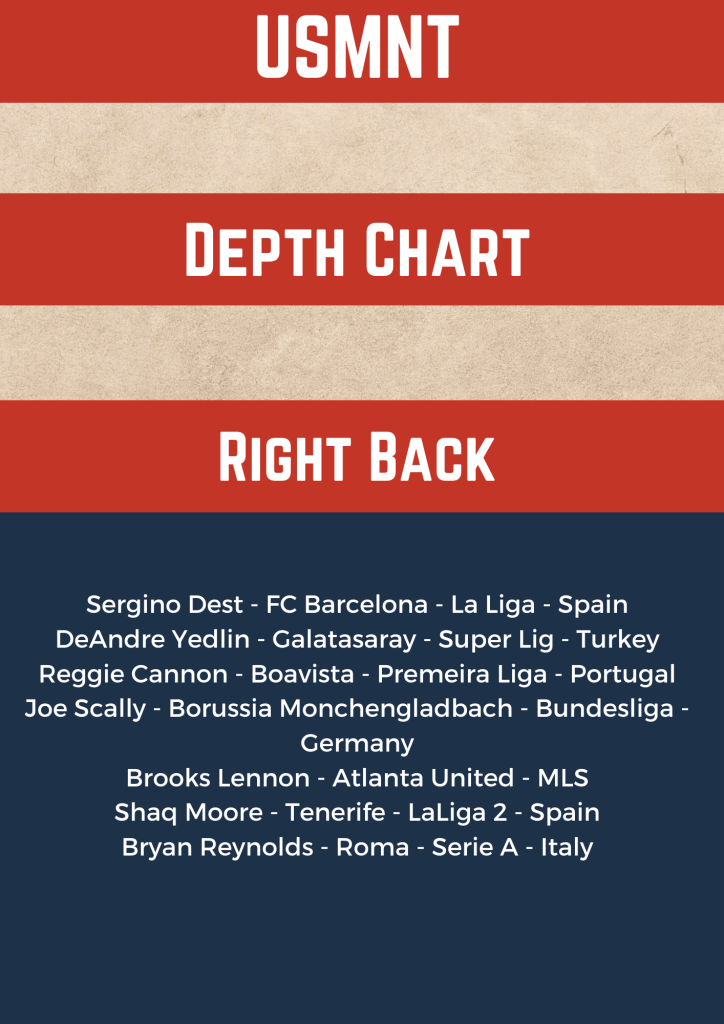 Added Brooks Lennon after he looked solid in his senior team debut, although he was a bit all over the place and Johnny regularly had to fall back to fill into the hole left by him. Bryan Reynolds got the call up which was good to see, but he is still seemingly a forgotten man at Roma. I also updated Shaq Moore as Tenerife is not in La Liga, but LaLiga 2.