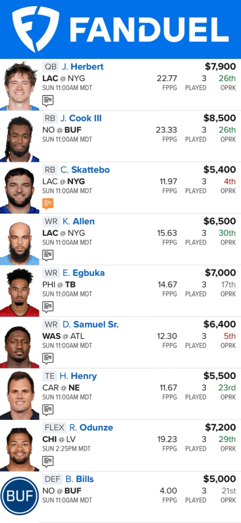 Justin Herbert headlines the FanDuel lineup, paired with Keenan Allen in a classic QB–WR stack against the Giants. Emeka Egbuka adds ceiling at WR, while Deebo Samuel provides a balanced all-around role. Rome Odunze appears again, this time in FLEX, doubling down on his WR1 role in Chicago.