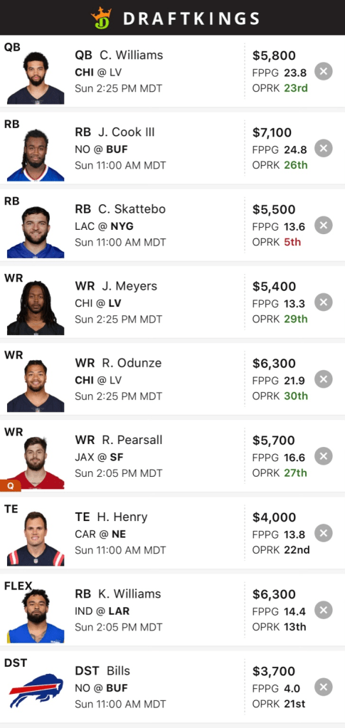 Caleb Williams leads this build, paired with Rome Odunze in a stack that’s becoming a weekly fixture. Odunze has fully established himself as Chicago’s WR1, and by adding Jakobi Meyers on the bring-back, this lineup bets on a high-scoring shootout with both sides contributing. Ricky Pearsall is a steady-value WR with strong usage, and Hunter Henry repeats as a budget-friendly TE who still brings touchdown equity.