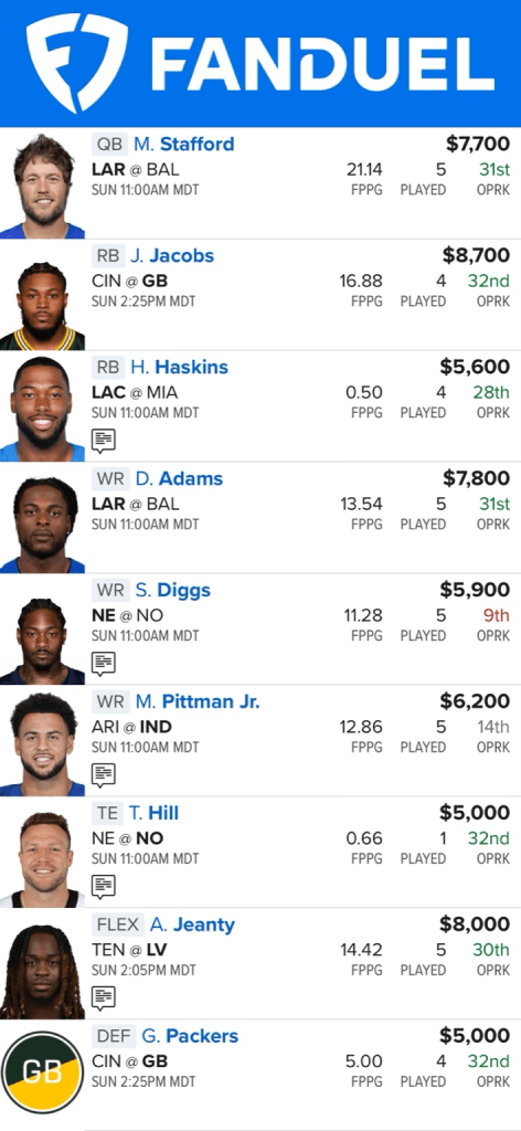 Matthew Stafford leads the FanDuel side in a correlation stack with Davante Adams, banking on volume and red-zone work. Jacobs again anchors the backfield, while Jeanty repeats as FLEX for both value and explosiveness.