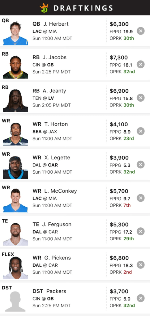 Justin Herbert anchors the DraftKings build in what should be a fast-paced matchup with Miami. Ladd McConkey fits the stack as he finally had a good game last week and hoping he repeats that again this week. Jake Ferguson has been the top tight end in fantasy this year, and should be in line for another big week.