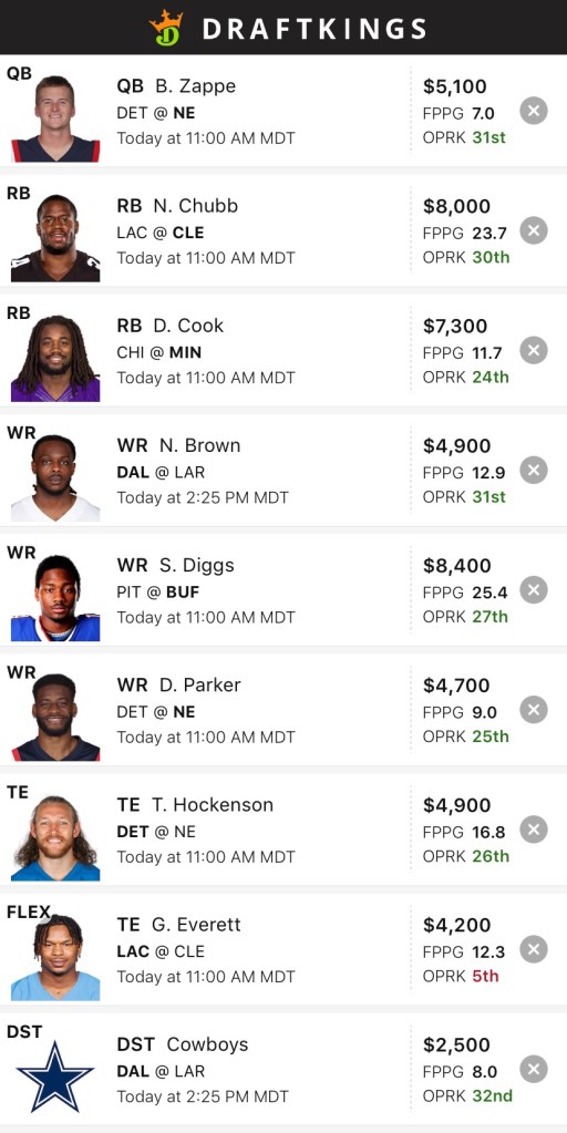 Stefon Diggs comes in discounted but still commands a target share worth chasing. Michael Pittman Jr. and Hill provide safe mid-tier floors, while Haskins supplies lineup flexibility if his usage climbs after the Hampton injury. The Packers D remains the budget-friendly constant across both builds with a pocket passing Joe Flacco in Cincy for less than a week and behind a line that puts the offensive in offensive line.