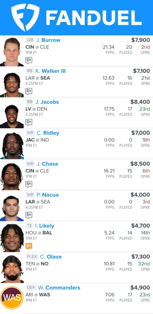 Josh Jacobs may have seen his touchdown streak end, but the workload hasn’t. Ashton Jeanty’s dual-threat skill set continues to flash, making him a worthy pairing. Horton and Legette round out the receiving corps as low cost flyers with real upside. Green Bay’s defense provides cap-friendly stability against Cincinnati.